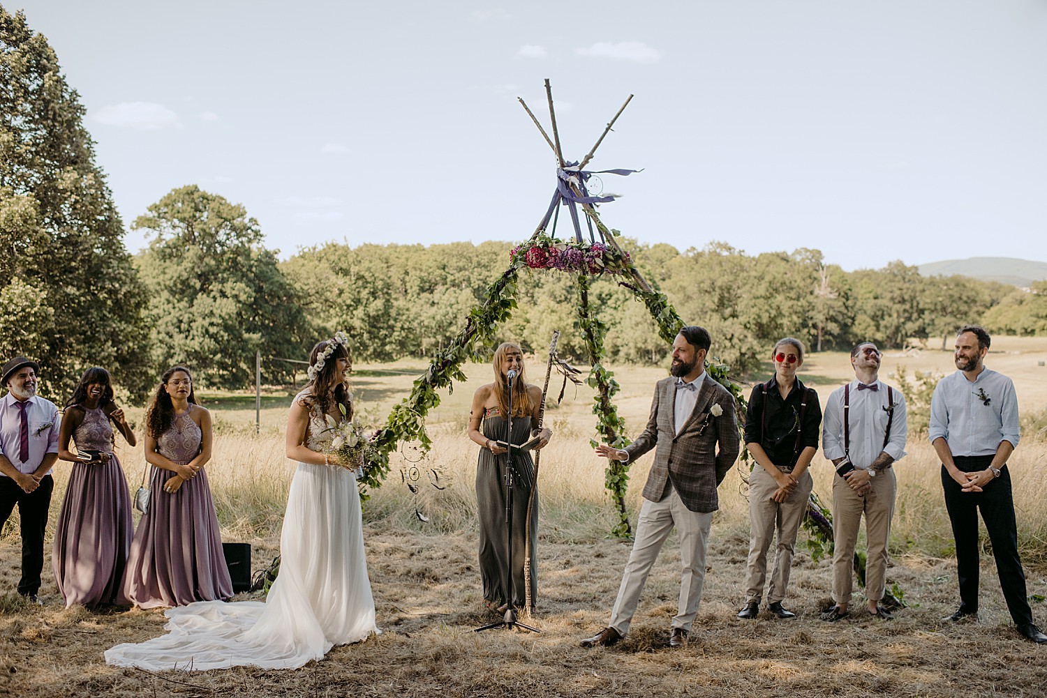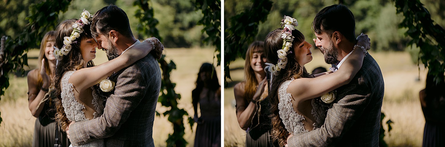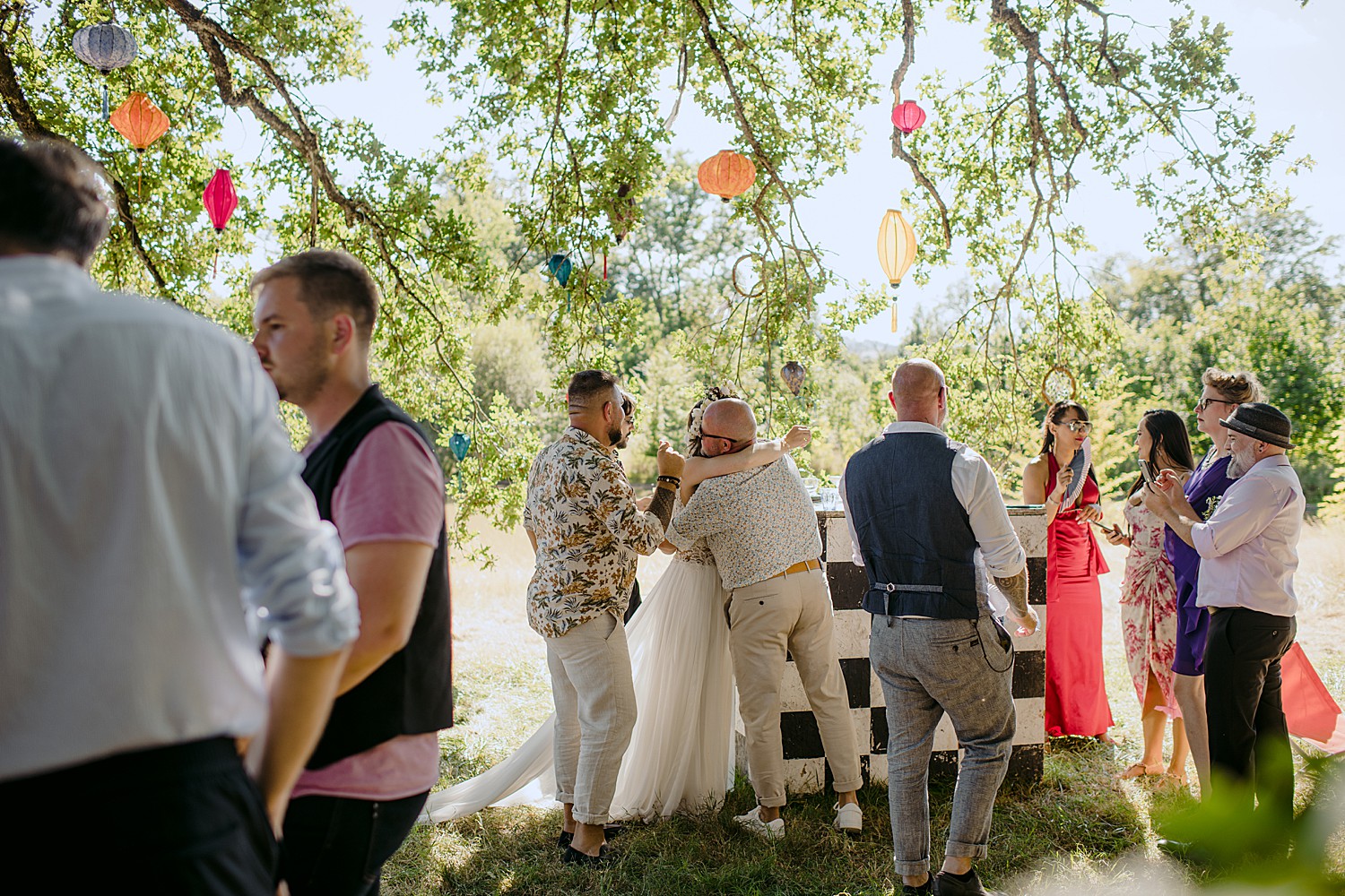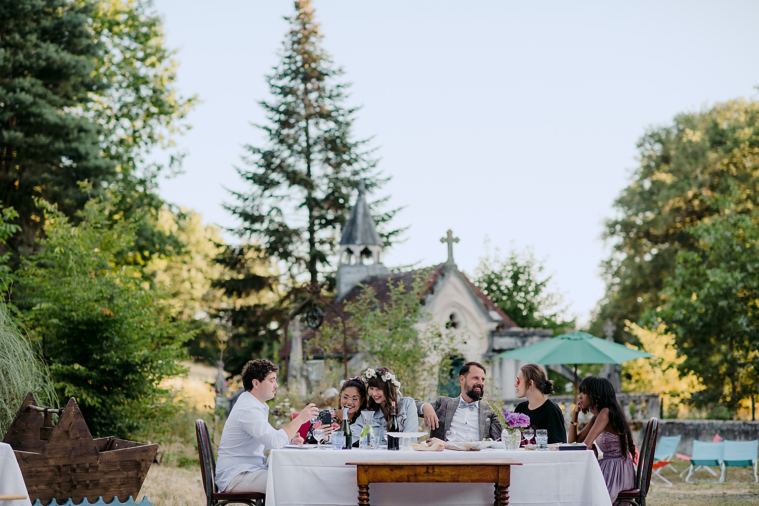 Built as far back as the 15th Century, the castle sits in the middle of a sprawling 20 hectare park. The park is home to a huge shady oak tree (where the ceremony was held), a small lake, rolling fields and a sustainable vegetable garden that supplies organic produce to the locals. The castle’s former owner was an eccentric Napoleon fan who added medieval style towers and a tiny outdoor gothic chapel. Since it’s takeover in 2013, the Chateau’s history of eccentricity has continued. It’s now the charming home of non-profit ‘Fou de Fougerette‘, an association that promotes the celebration of art and culture in all forms through sustainable, climate conscious activities.