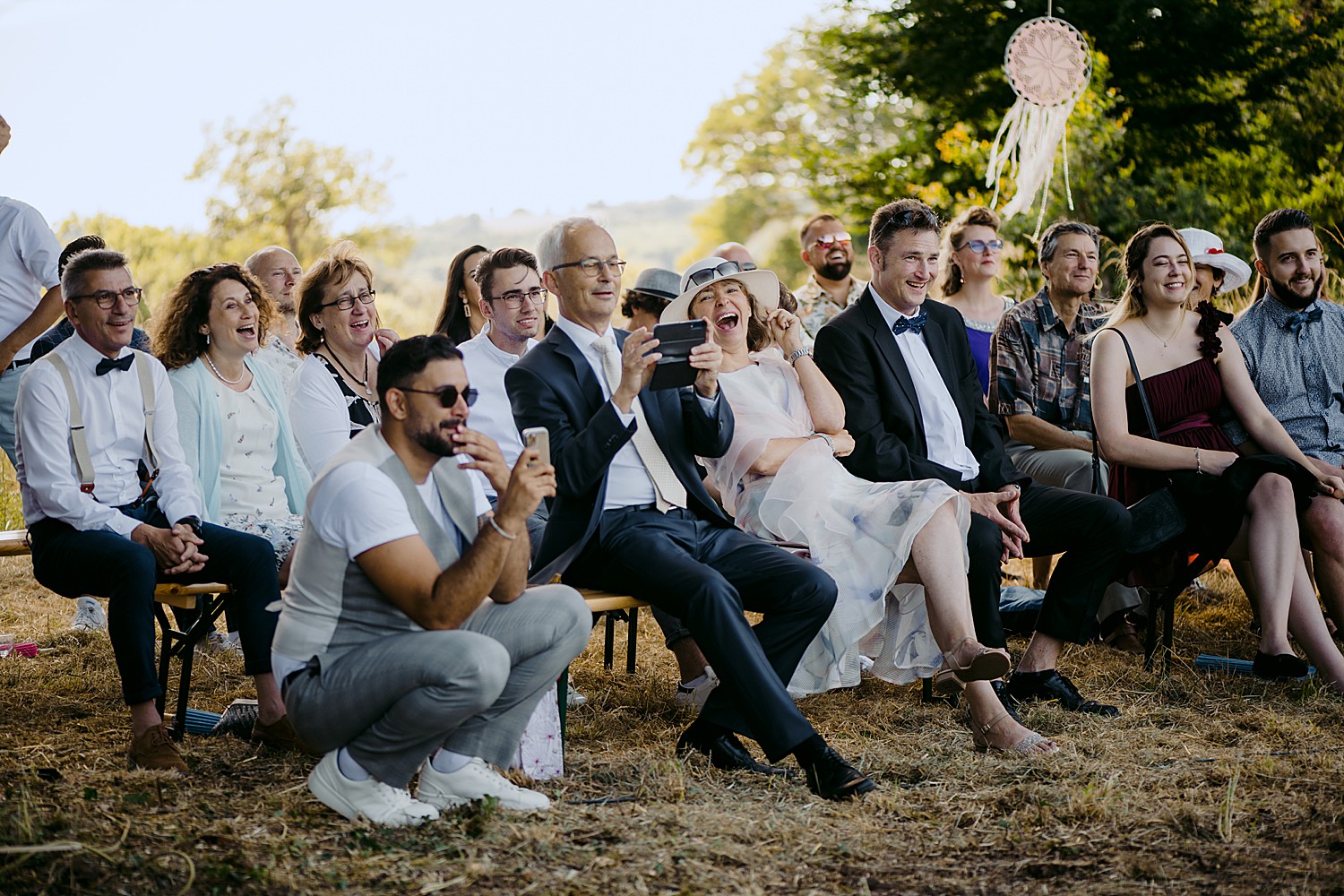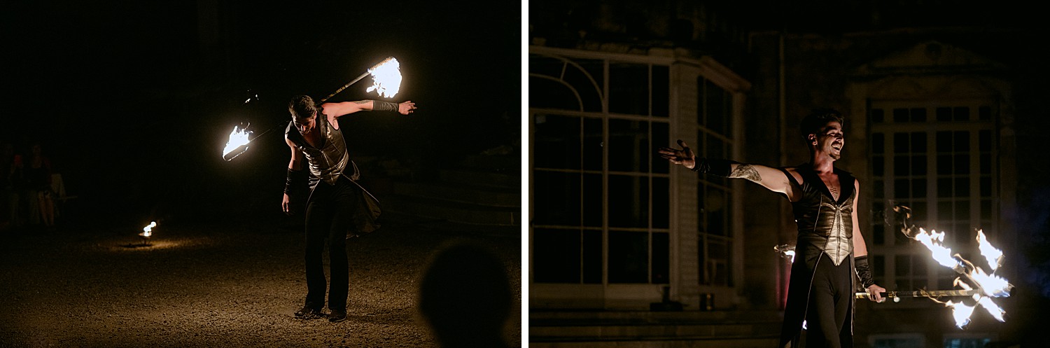 The rest of the day played out perfectly. After a moving ceremony under the oak tree held by one of Samy’s best friends, guests moved to the old wooden ‘ship’ by the lake for the aperitif, and later enjoyed a relaxed dinner under the stars in the castle courtyard, and a fire show.